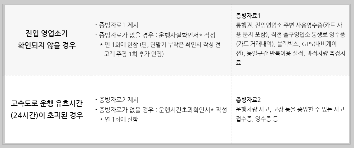 영수증, 블랙박스 등 다양한 방법으로 증빙 가능하고, 증빙자료가 없으면 1년에 한 번에 한해, 운행사실확인서를 작성하면 실제 거리 요금만 낼 수 있다고 해요.