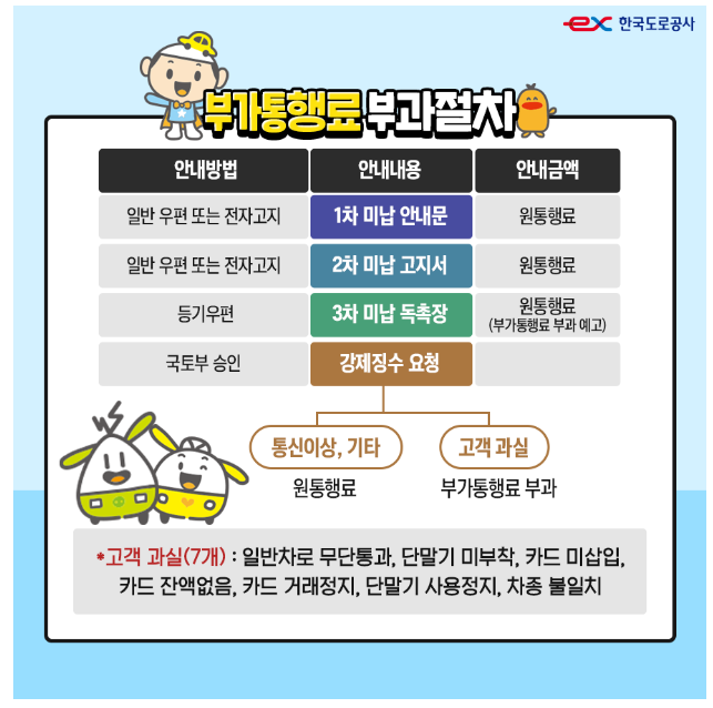 고속도로 미납 통행료를 납부하지 않으면 부가통행료가 부과되게 됩니다. 부과 절차는 다음과 같습니다.