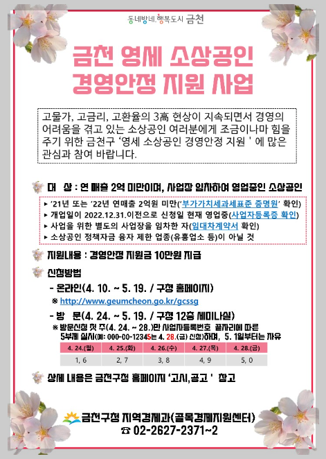 코로나19 장기화, 3高(고물가,고환율,고금리) 및 난방비 폭등 등으로 어려움을 겪고 있는 영세 소상공인의 부담 완화를 위해 「2023년 금천구 영세 소상공인 경영안정 지원 사업」을 붙임과 같이