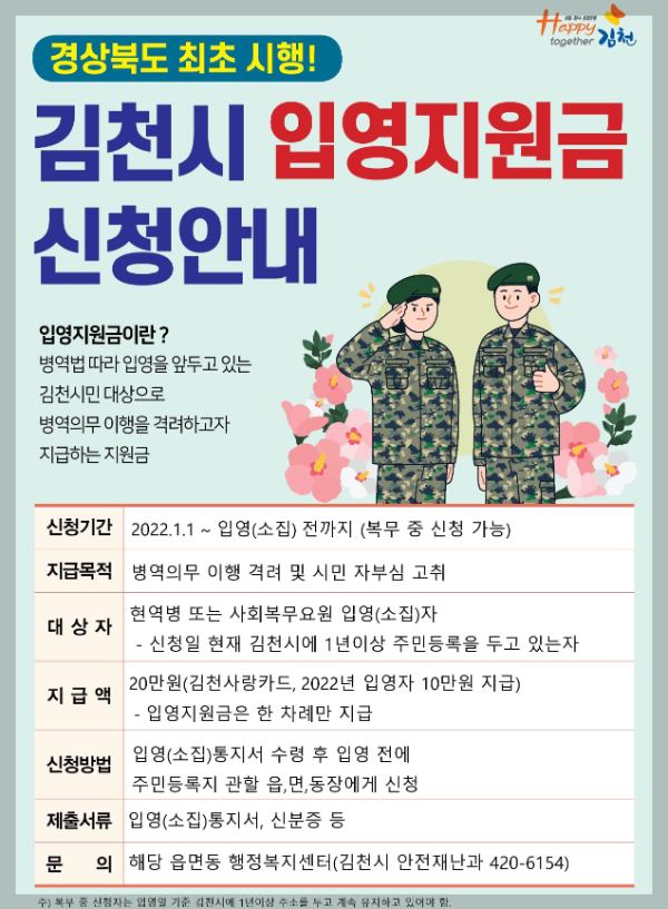 김천시와 충주시가 입영지원금 제도를 시작하였으니, 기한내에 꼭 신청하세요!