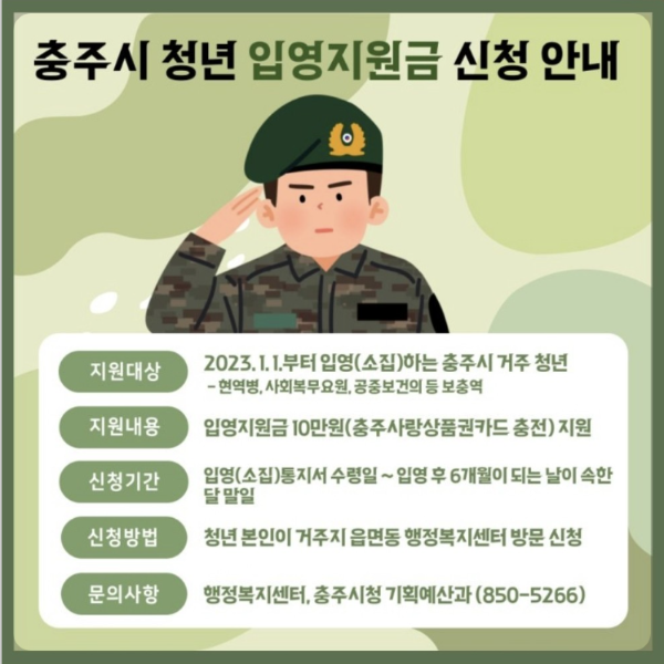 충주시는 청년의 복지 증진 및 병역 의무 이행을 격려하기 위해 충북 도내 최초로 청년 입영지원금을 지원합니다.