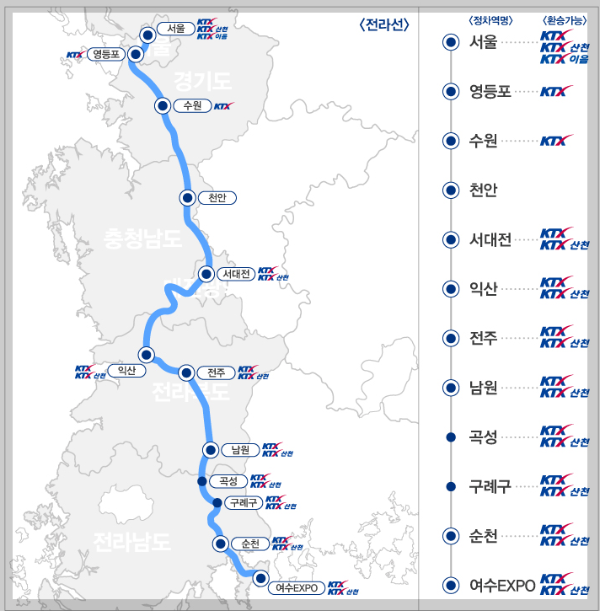 - [전라선]서울-영등포-수원-천안-서대전-익산-전주-남원-곡성-구례구-순천-여수EXPO