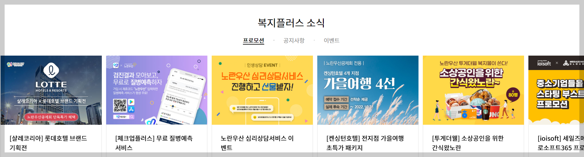 - 쇼핑몰 : 복지몰, 기획상품 (가구, 가족사진촬영, 자동차정비, 주유 등) 할인지원