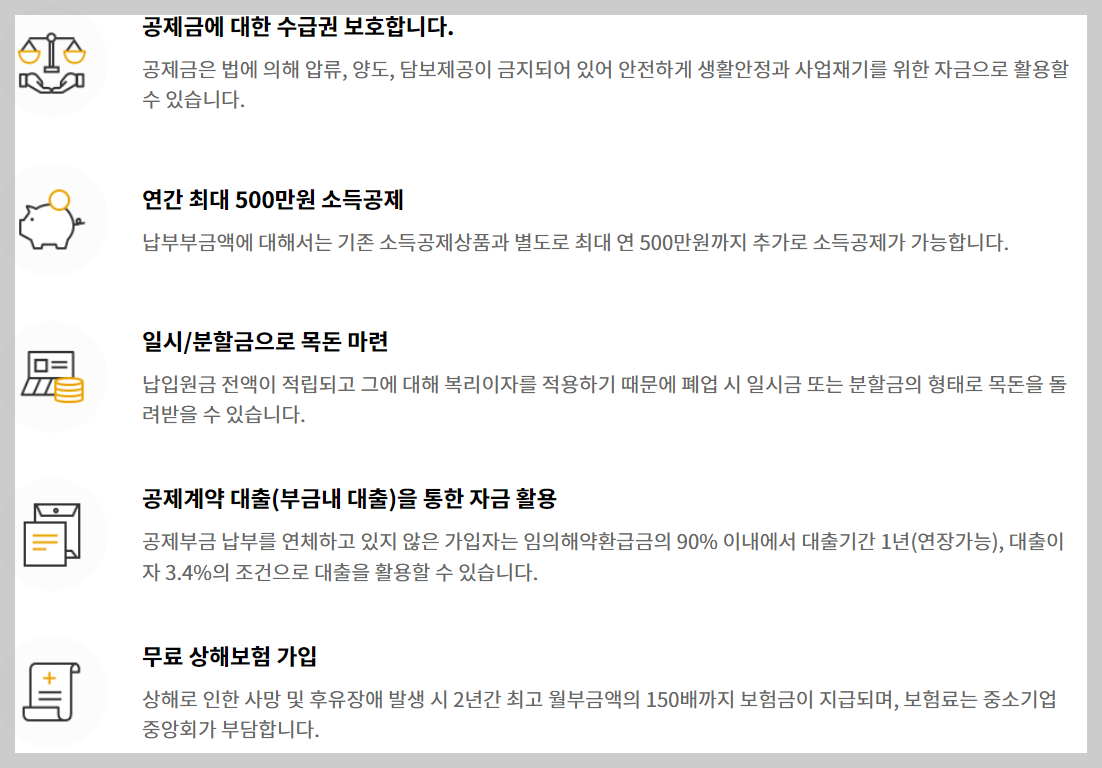 공제금은 법에 의해 압류, 양도, 담보제공이 금지되어 있어 안전하게 생활안정과 사업재기를 위한 자금으로 활용할 수 있어요.
