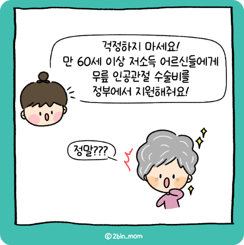 나이가 들면 무릎이 약해지기 마련인데요. 무릎인공관절 수술 비용이 부담스러워서 참고 계시는 분들께 좋은 정부 지원 사업이 있어서 알려드립니다. 대상이 되시는 분들은 더 이상 참지 마시고 꼭 도움 받으시길 바랍니다!