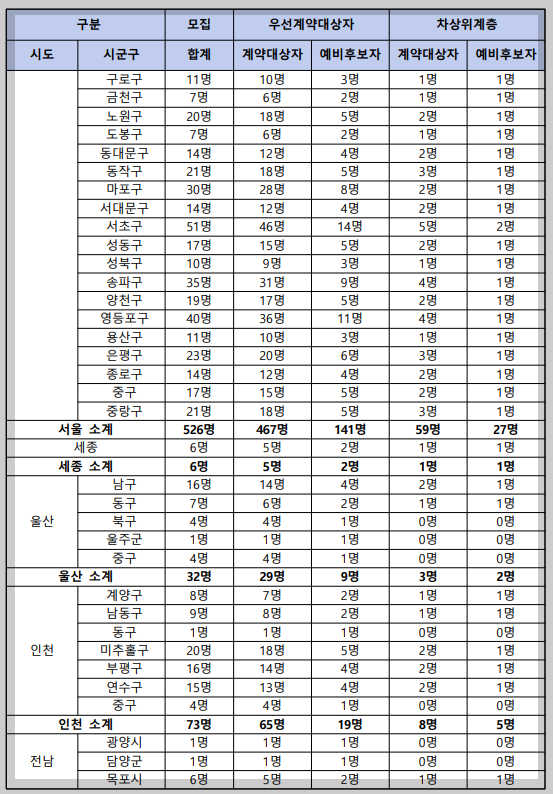 - 신청 기간 현재, 우선 계약 대상자 또는 차상위계층에 속하는 자