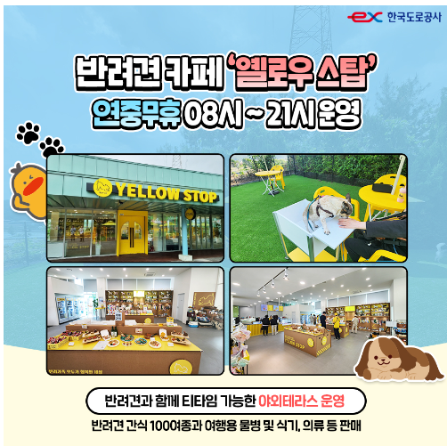 마장 휴게소에는 반려견 카페 '옐로우 스탑' 연중무휴 08시 ~ 21시 운영되고 있어요. 반려견과 함께 티타임 가능한 야외 테라스도 운영하고, 반려견 간식 100여 종과 여행용 물병 및 식기, 의류 등을 판매 중입니다!