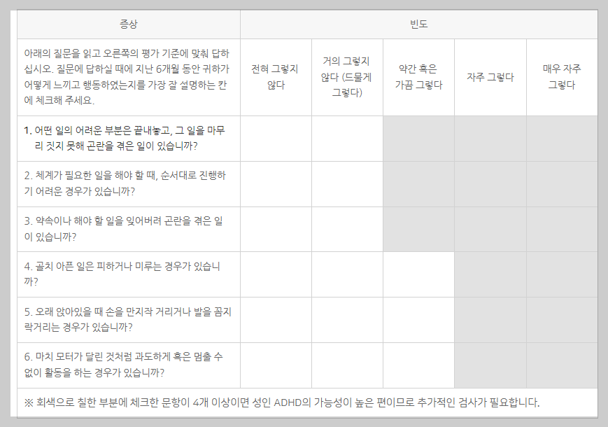 성인 ADHD는 ASRS(Adult ADHD Self-Report Scale) 테스트를 통해 자가진단할 수 있습니다. 이 테스트는 일상생활에서 겪는 다양한 상황에 대한 반응을 평가합니다. 테스트에서 회색으로 칠한 부분에 체크한 문항이 4개 이상이면 추가적인 검사가 필요합니다.