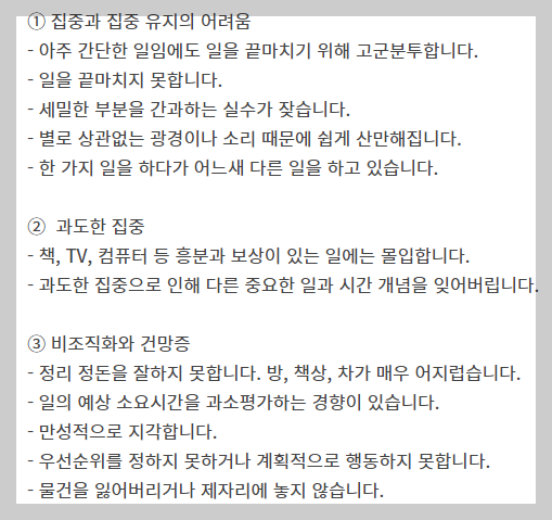성인 ADHD의 주요 증상은 다음과 같습니다: