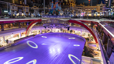 낮에는 유리돔 천장에서 내리쬐는 자연광을 맞으며, 밤에는 테마파크와 퍼레이드 축제의 야경을 즐기며 스케이팅을 할 수 있어요.