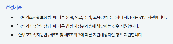 - 「국민기초생활보장법」에 따른 수급자 및 법정 차상위계층 「한부모가족지원법」 에 따른 지원 대상자