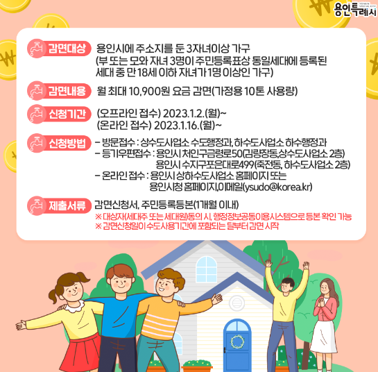 2023년에는 용인시에서 3자녀 이상 가구를 대상으로 ‘상하수도요금’ 감면 신청을 받습니다. 용인시에 주소지를 둔 3자녀 이상이고, 그중 만 18세 이하 자녀가 1명 이상인 가구라면 신청이 가능한데요. 월 최대 10,900원 요금 감면이 진행되니 자세한 내용 확인하시고 꼭 신청하세요!