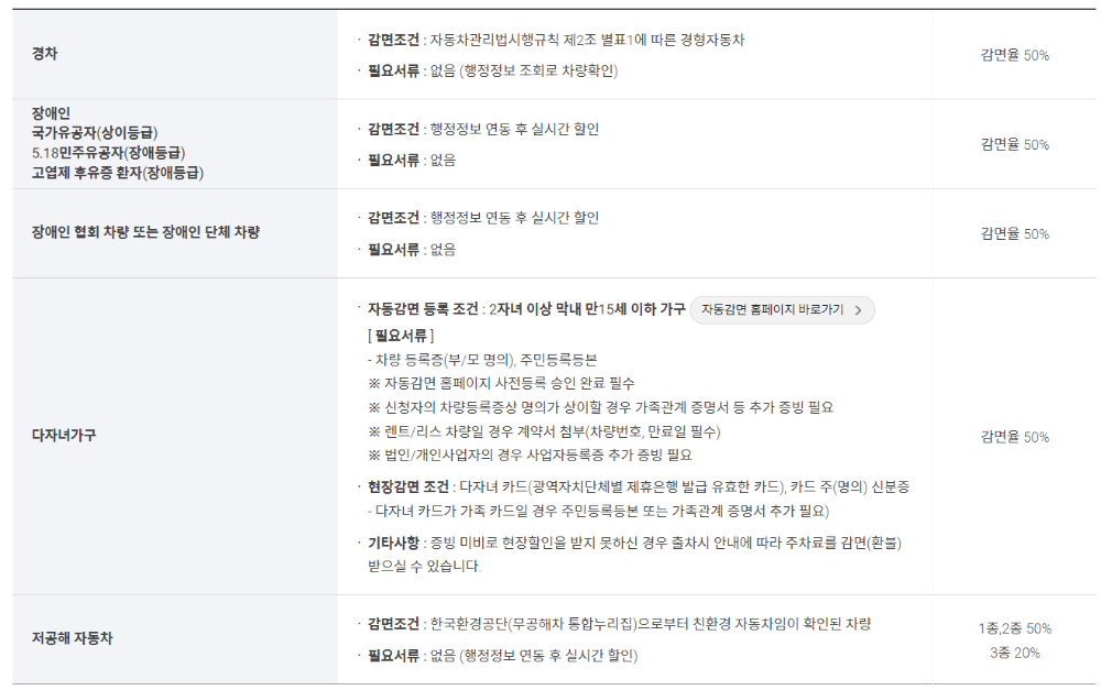 다자녀가구의 경우도 50% 할인이 가능하며, 저공해 자동차의 경우 1종, 2종은 50% 할인, 3종은 20% 할인이 됩니다
