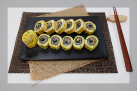 ④ 살짝 덜 익은 달걀부침 위에 오곡 김밥을 올린 후 돌돌 말아줍니다.