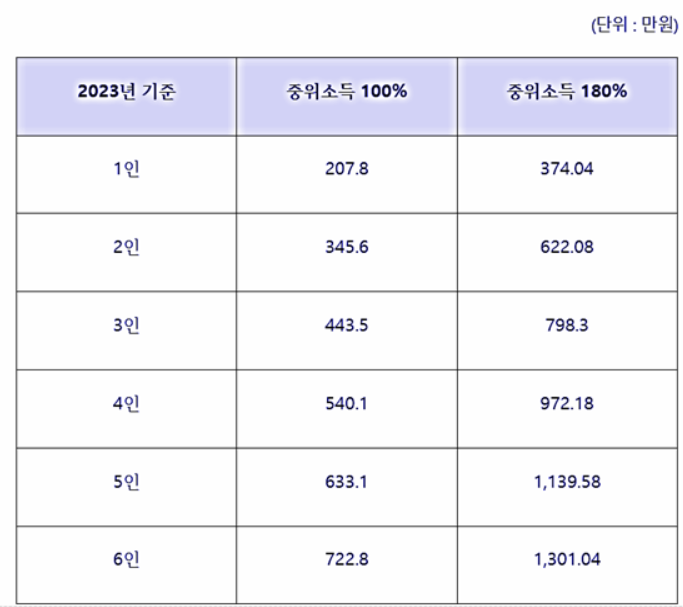 ✅️ 개인소득 6000만 원 이하 및 가구소득 중위 180%(374~1,301만 원) 이하(소득이 없으면 신청이 불가능)