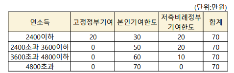 본인 소득이 3,600만 원 이하, 가구소득도 중위소득 180% 이하인 청년이 매월 50만 원 저축 하면, 저축비례 정부지원금은 20만원으로, 총 70만원을 납입하는 효과가 있습니다.