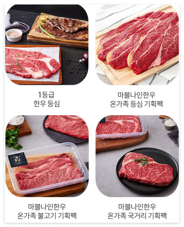 '1등급 한우 등심(100g)'과 '마블나인 한우 등심(100g)'이 대표 상품으로 행사 카드로 결제하면 기존 판매가의 절반 가격에 구매할 수 있습니다.