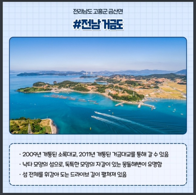 · 2009년 개통된 소록대교, 2011년 개통된 거금대교를 통해 갈 수 있어요