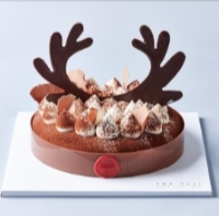 사슴 모양 초콜릿으로 예쁘게 장식되어있는 머드 케이크는 다크 초콜릿으로 만든 진한 초콜릿 케이크로, 초콜릿을 정말 좋아하시는 분이시라면 강력 추천합니다. - 산타 모자 케이크[팥앙금 녹차무스] 80,000원