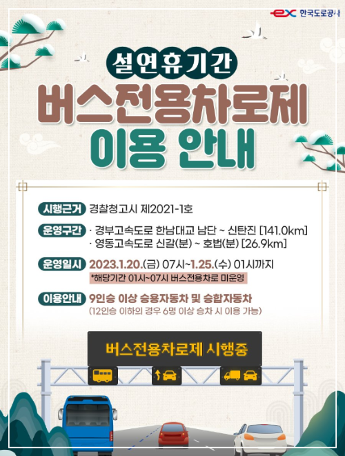 올해 설 연휴에 고속도로 이용 많이 하실 텐데요. 고속도로를 이용하실 분들을 위해 버스전용차로제 운영 구간과 기간 등을 자세히 알려드리겠습니다. 위반 시 벌점도 있으니 주의해 주세요~