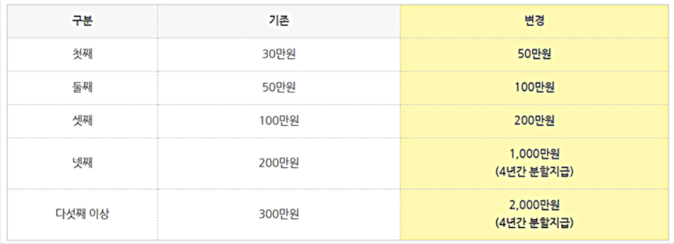 올해부터 첫째 50만 원, 둘째 100만 원, 셋째 200만 원, 넷째 1000만 원(4년간 분할지급), 다섯째 이상 2000만 원(4년간 분할지급)으로 전면 확대되었답니다.
