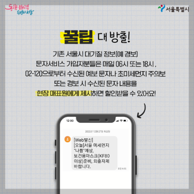 - 매일 06시 또는 18시에 02-120으로부터 수신한 예보 문자, 초미세먼지 주의보 문자를 현장 매표원에게 제시하세요